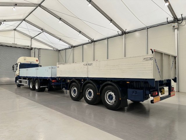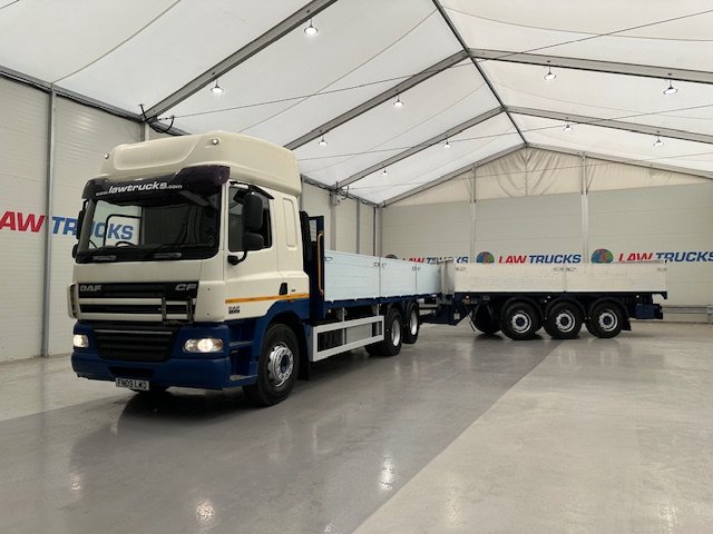 - 2009 DAF CF85 410 6x2 10 Tyre Rear Lift Sleeper Cab Dropside with 2007 Wheelbase Tri Axle Drawbar Dangler Trailer.