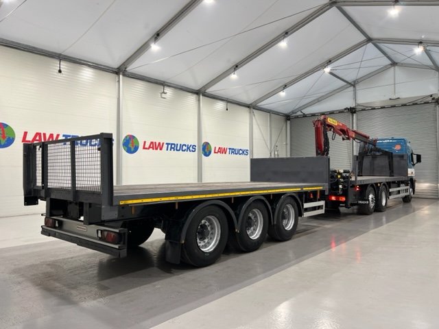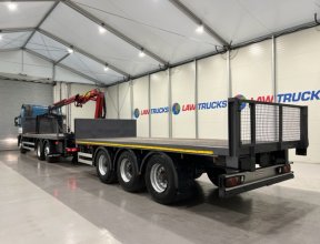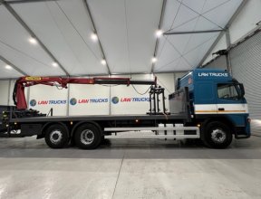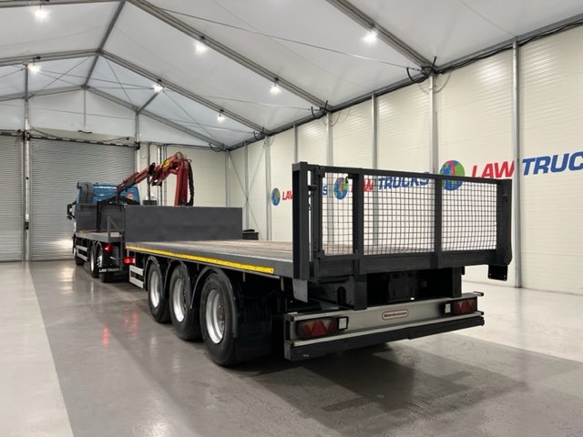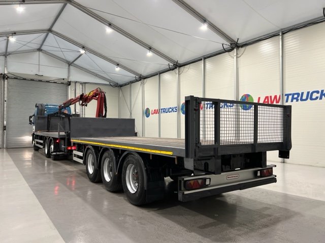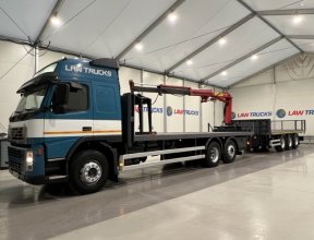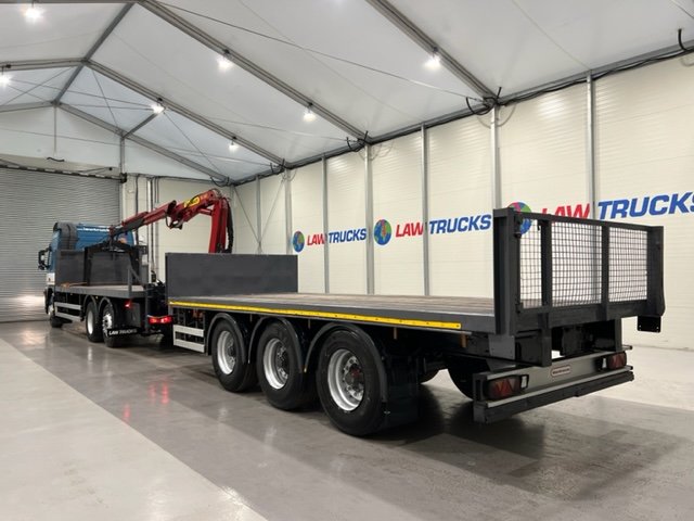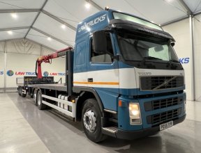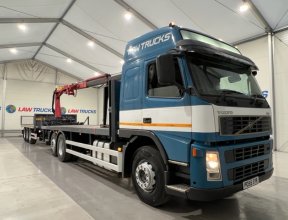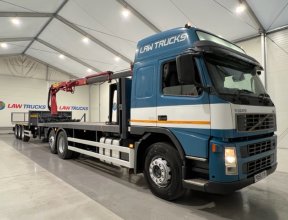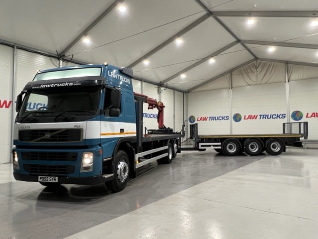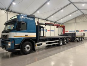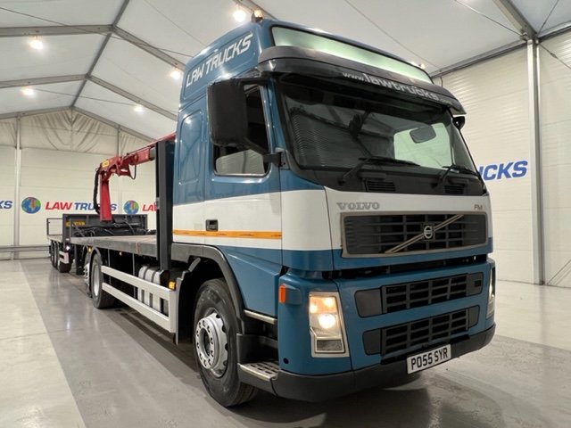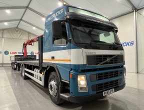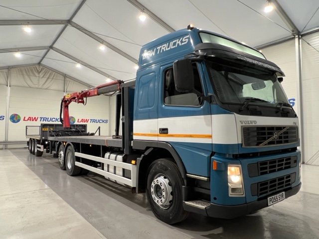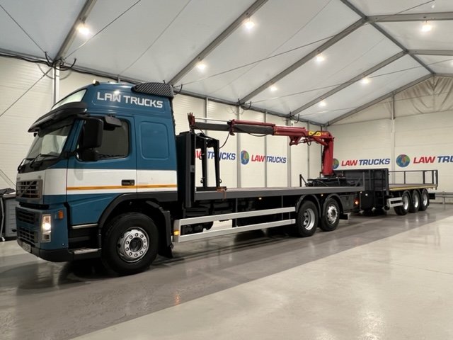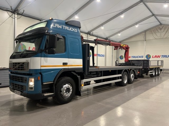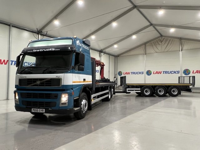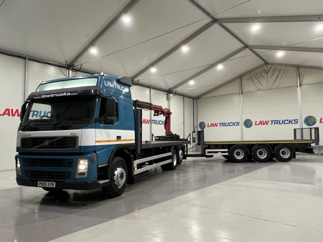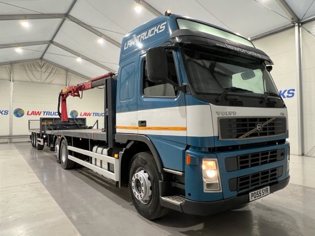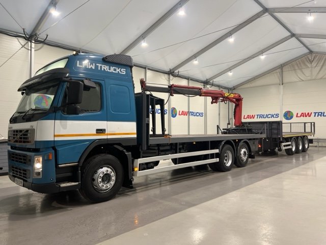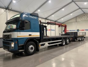 - 2005 Volvo FM 6x2 Rear Lift Sleeper Cab Flatbed Brick Grab with 2014 Tri Axle Drawbar Trailer.