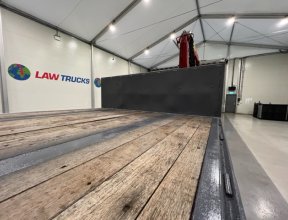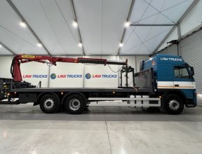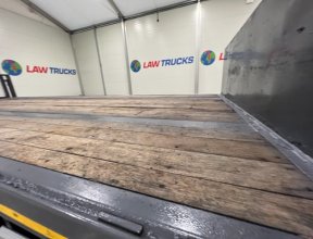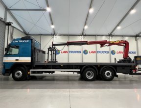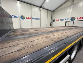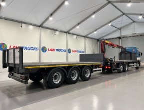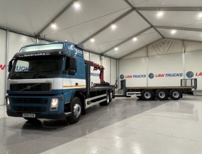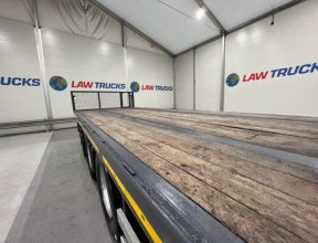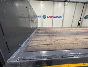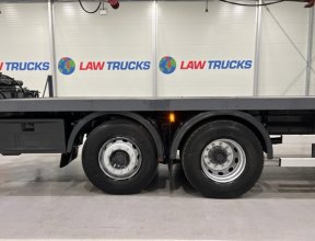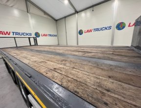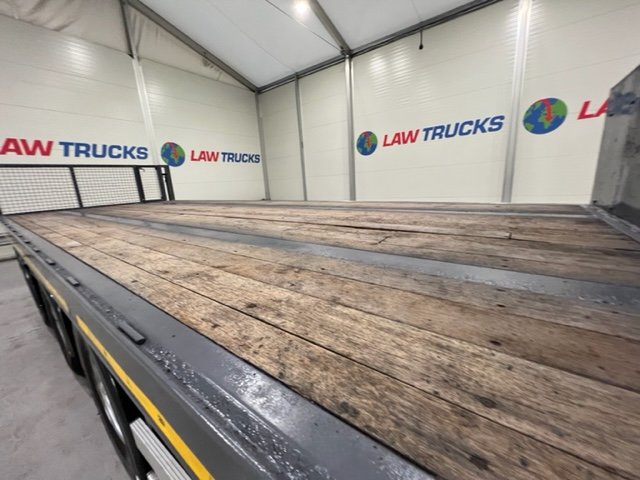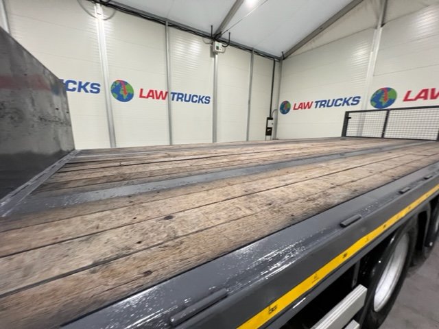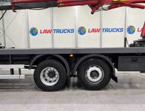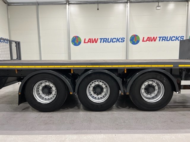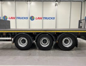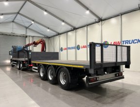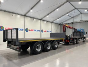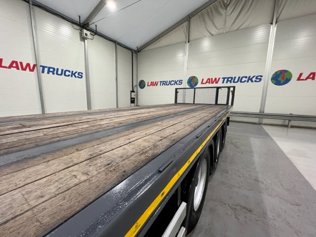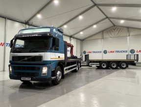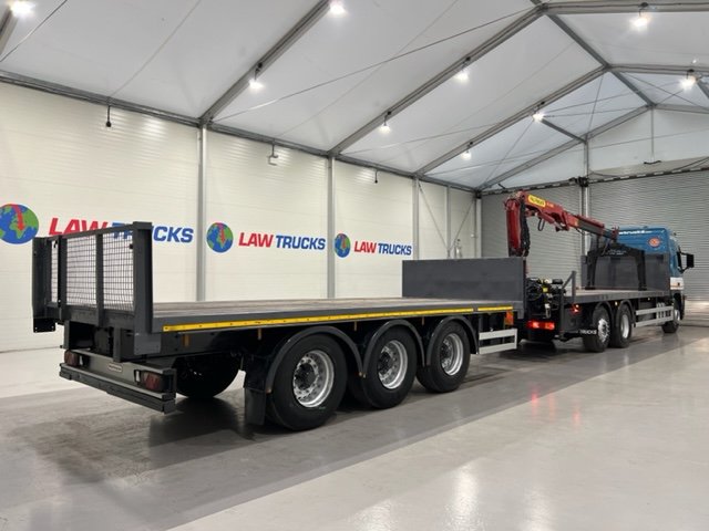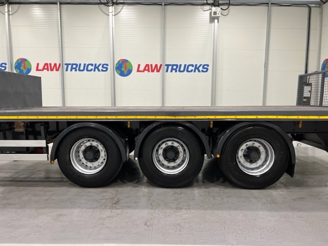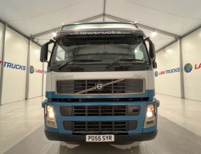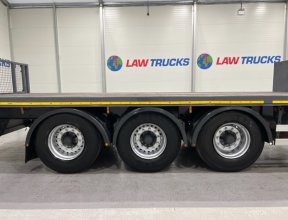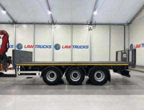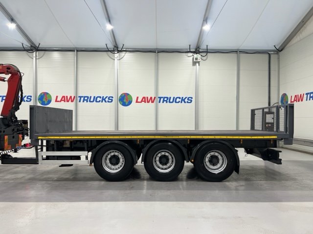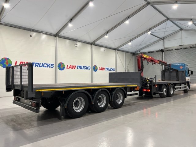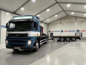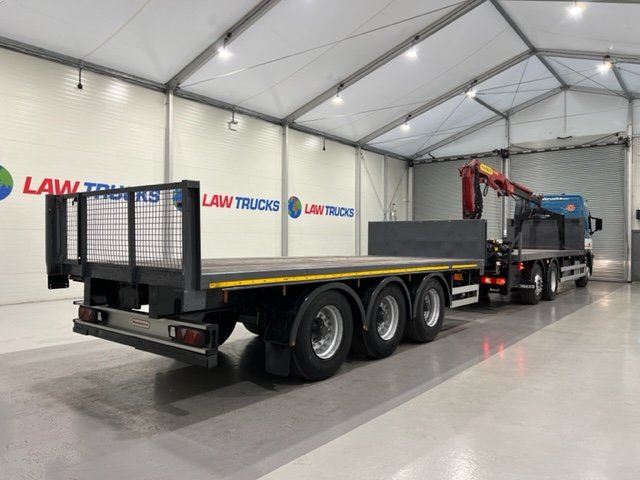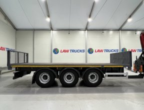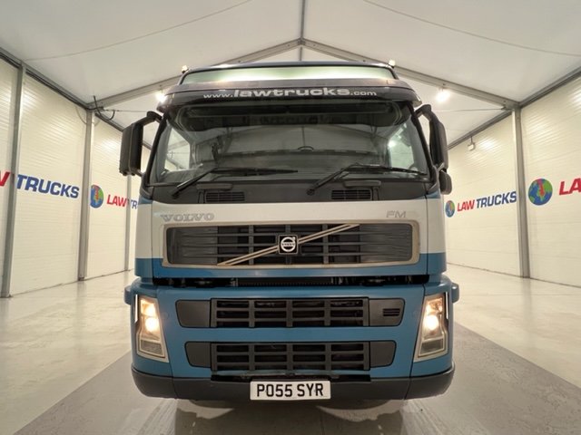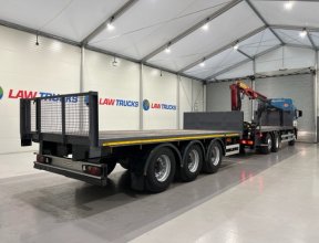 - 2005 Volvo FM 6x2 Rear Lift Sleeper Cab Flatbed Brick Grab with 2014 Tri Axle Drawbar Trailer.