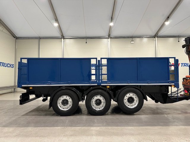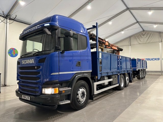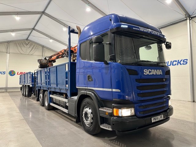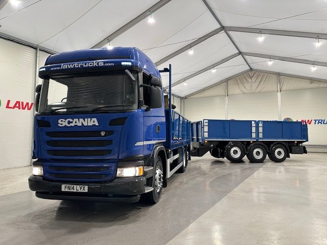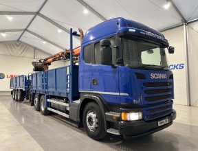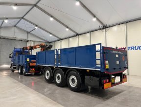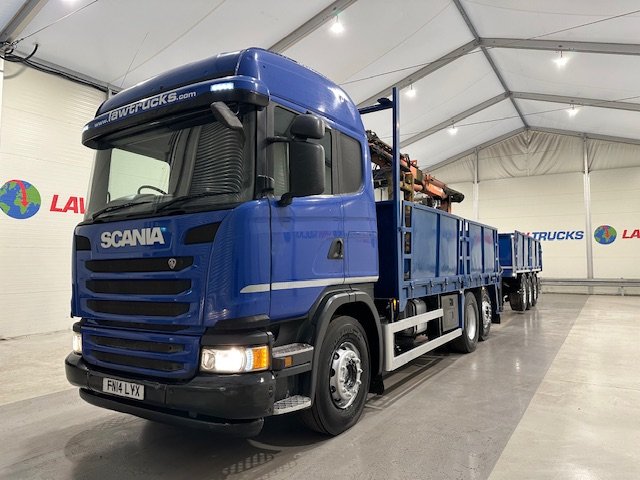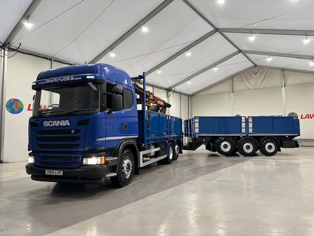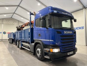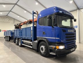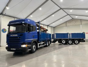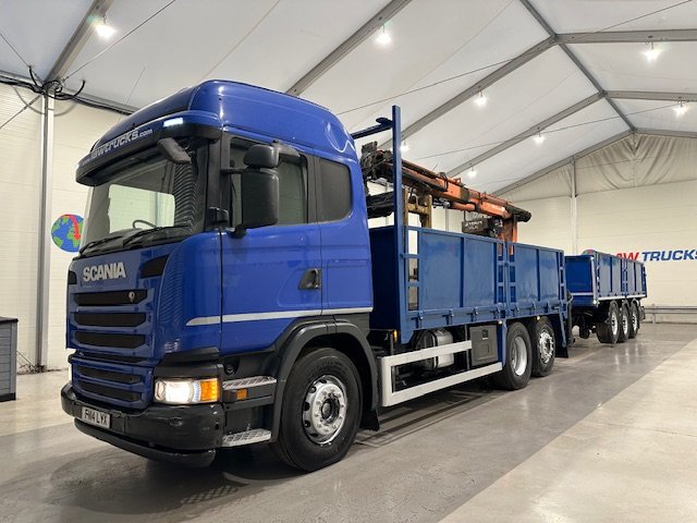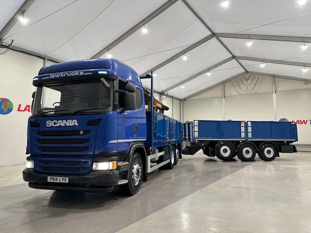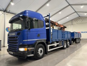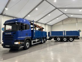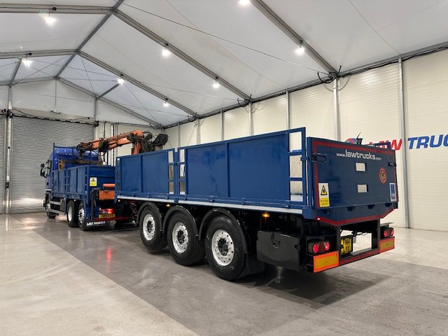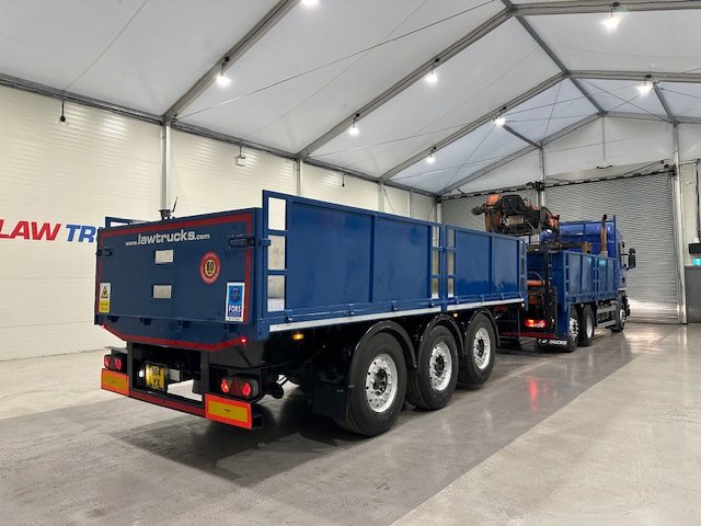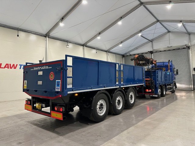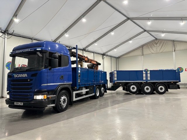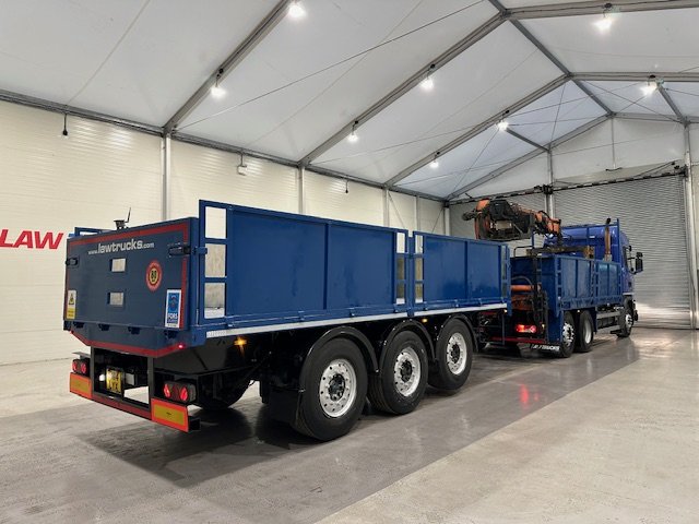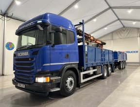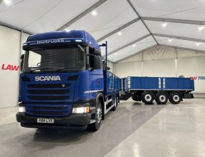 - Scania G410 6x2 Sleeper Cab Rear Lift Brick Grab Dropside Flatbed with Tri Axle Drawbar Dropside Dangler Trailer.