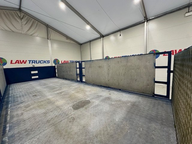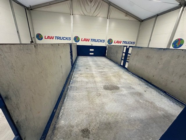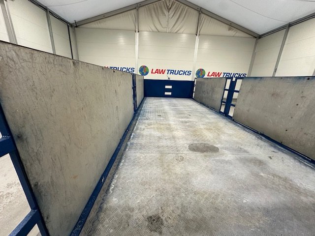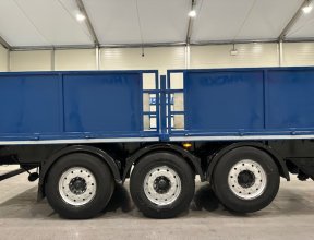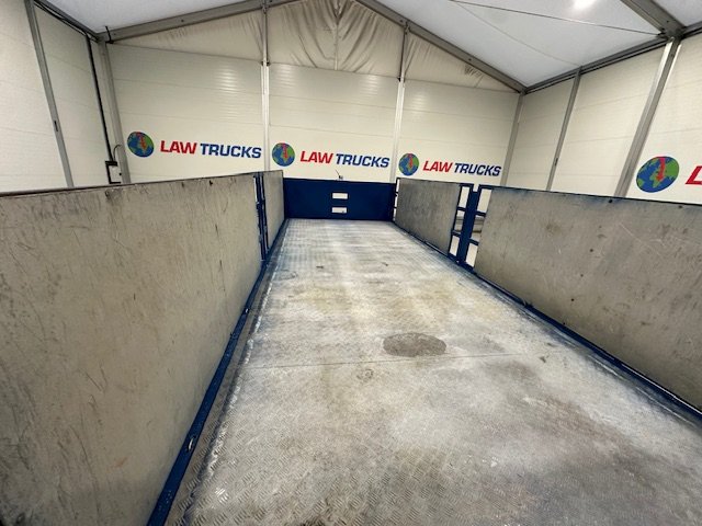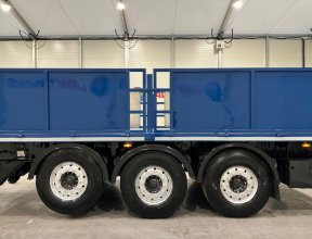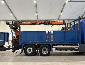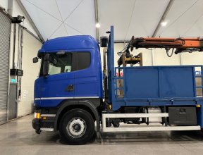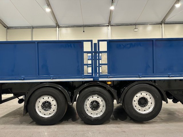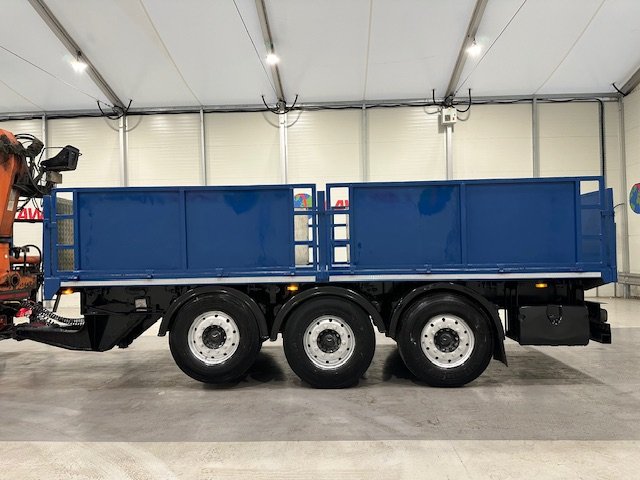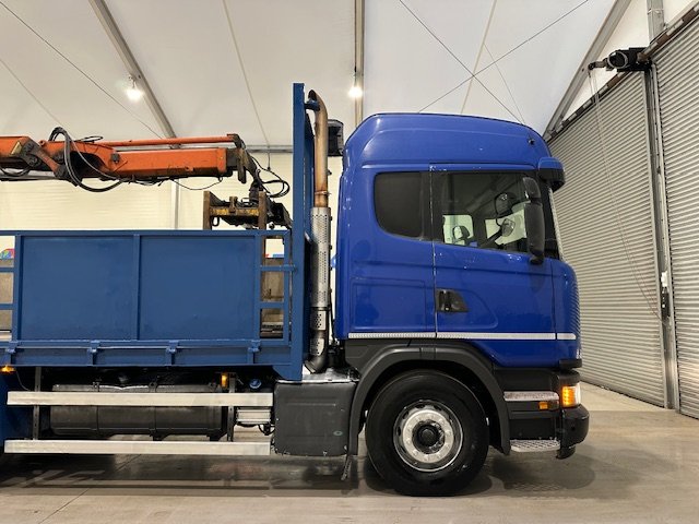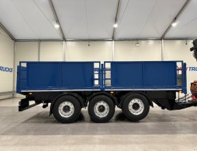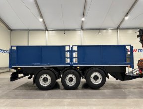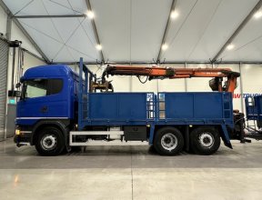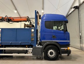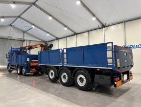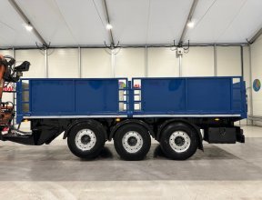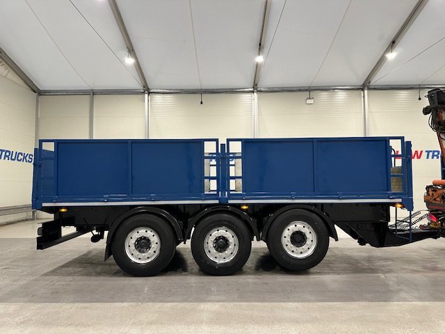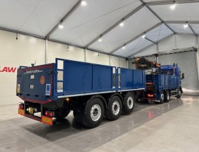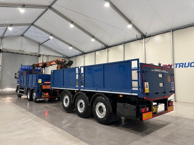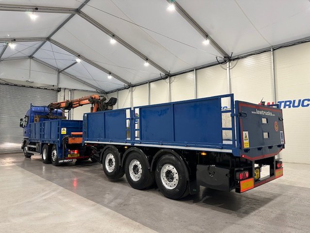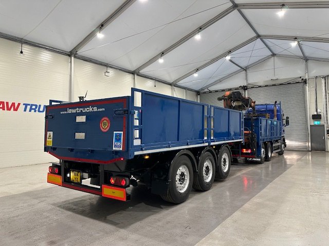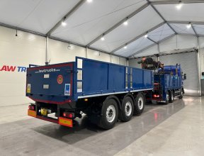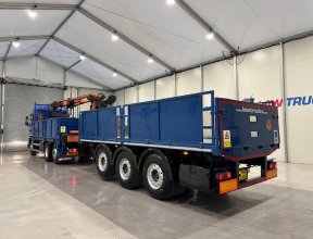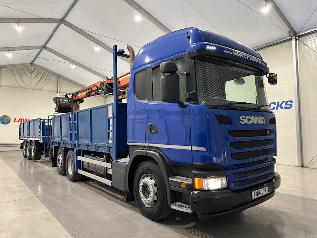 - Scania G410 6x2 Sleeper Cab Rear Lift Brick Grab Dropside Flatbed with Tri Axle Drawbar Dropside Dangler Trailer.