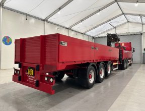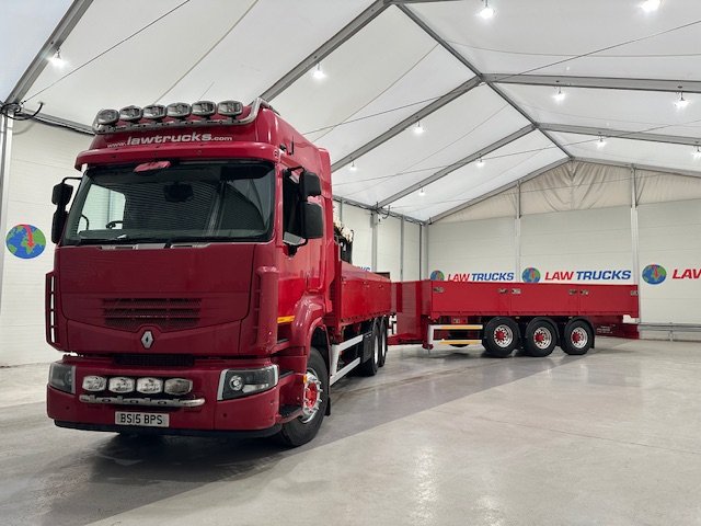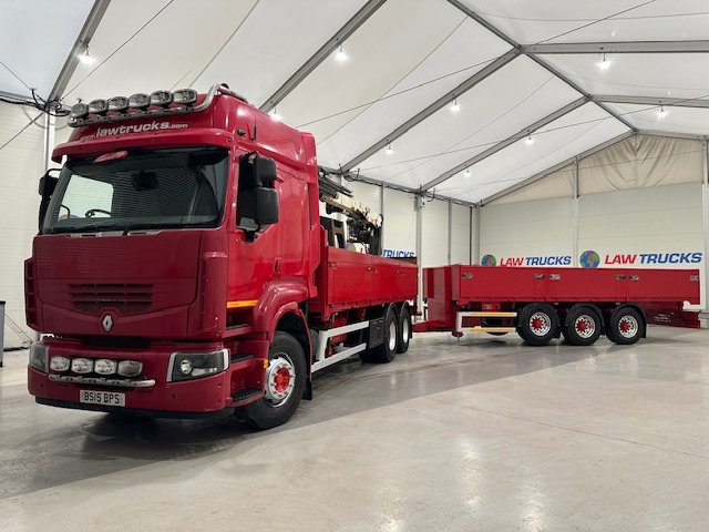 - 2015 Renault Premium 460 6x2 Rear Lift Sleeper Cab Dropside Brick Grab with 2015 Tri Axle Dropside Dangler Trailer.