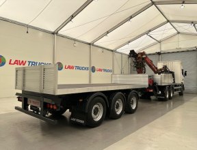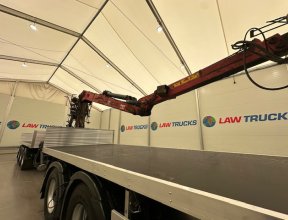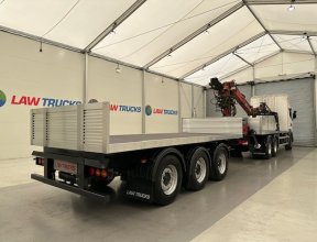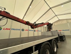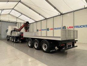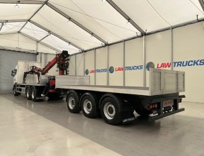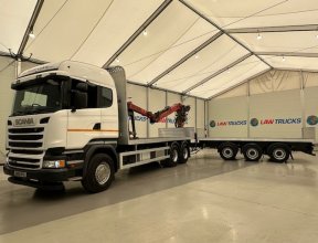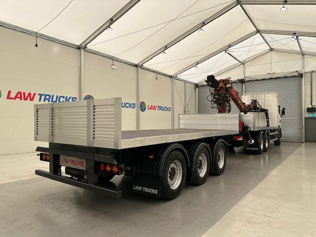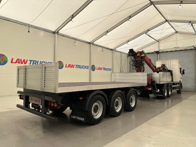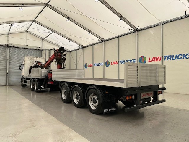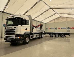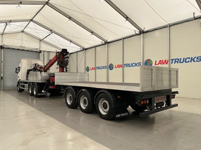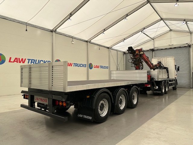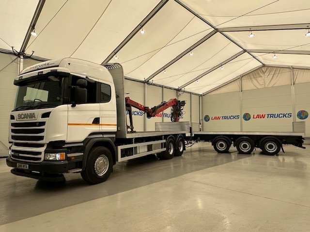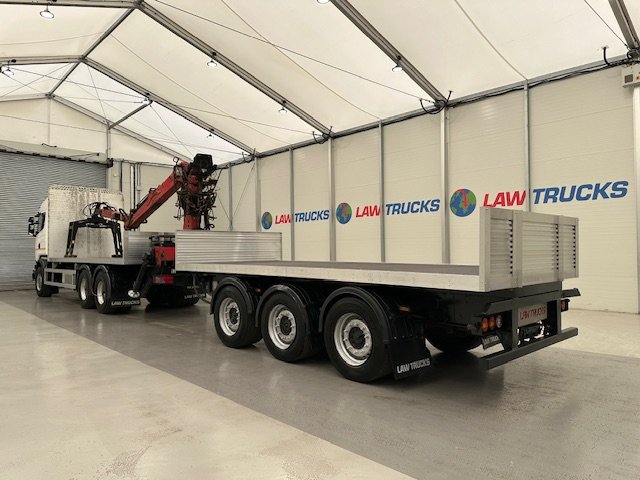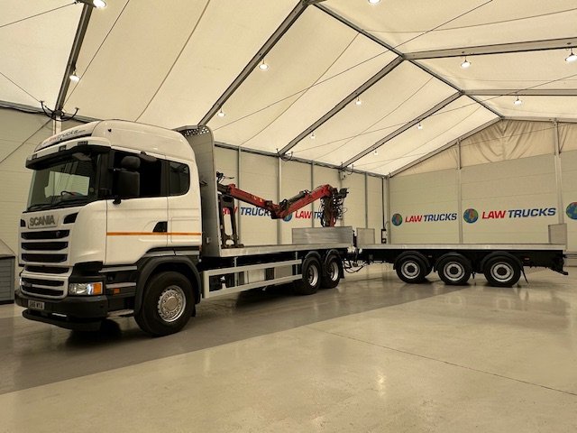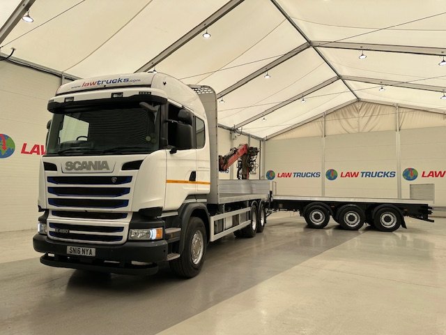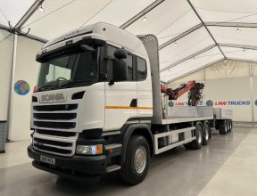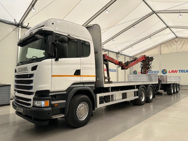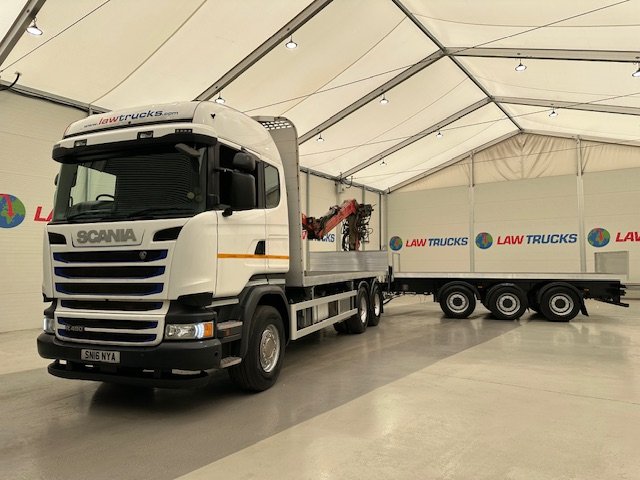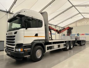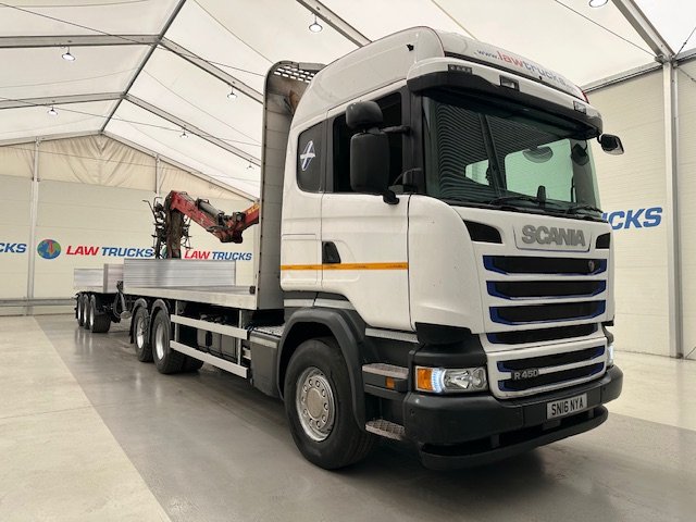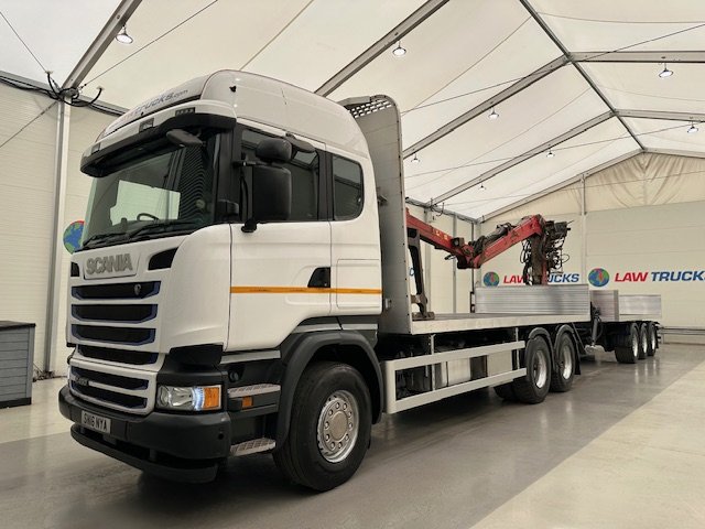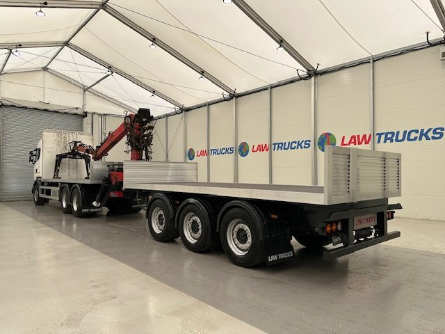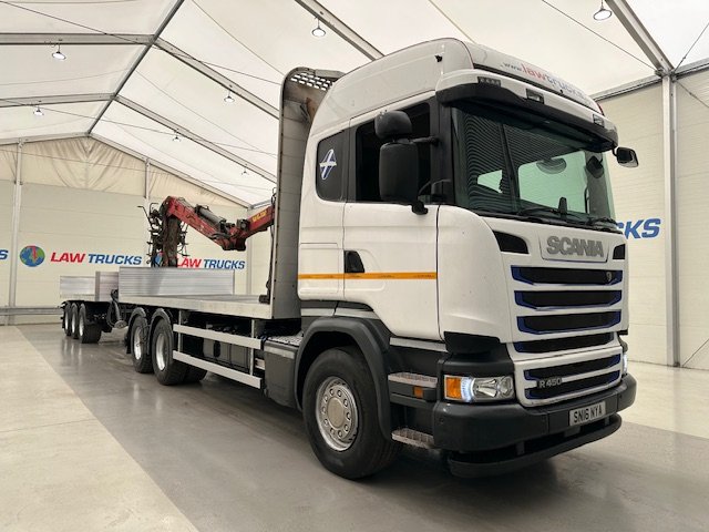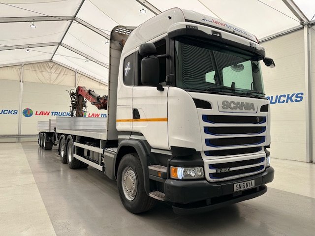 - 2016 Scania R450 6x2 Rear Lift Sleeper Cab Brick Grab Flatbed with 2016 Tri Axle Drawbar Flatbed Dangler Trailer